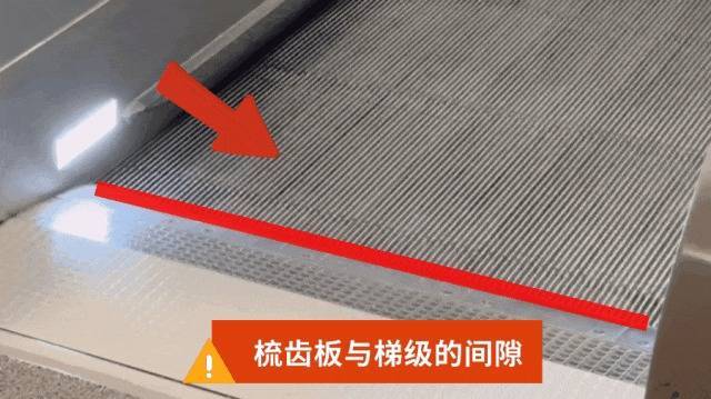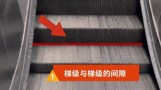 自动扶梯梳齿板与梯级、围裙板与梯级、梯级与梯级的间隙,容易卷吸衣服裙摆或材质柔软的鞋子,请勿在这些区域站立或停留。
