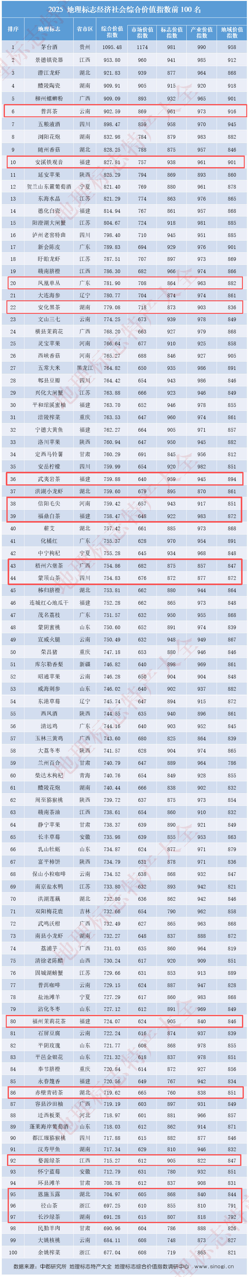 日前实倍网,北京中郡经济发展研究所与地理标志特产大全网完成并发布了《2025地理标志经济社会综合价值指数调研报告》,揭晓2025全国地理标志经济社会综合价值百强名单。其中,普洱茶、安溪铁观音、凤凰单丛、安化黑茶等15个茶叶品类进入2025全国地理标志经济社会综合价值前100名。